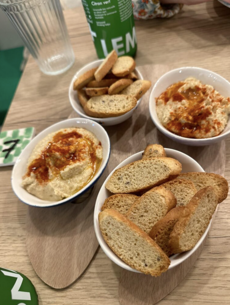 Tu peux lier créativité et gourmandise, en buvant un verre de vin, manger des en-cas salé (le Houmous est une réussite) ou sucrés…